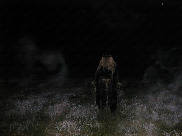 stands, with a burlap sack over its head and empty, hollow eyes. And
